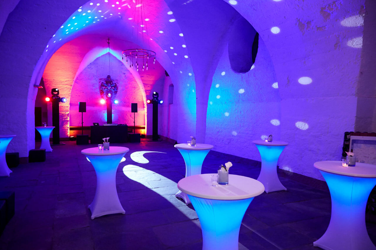 Als finales Element der Lasershow tat sich aus dem Torbogen ein beeindruckender Lasertunnel auf, der die Gäste nicht zum letzten Mal zum Staunen brachte. Ein wahres Erlebnis aus dem Torbogen herauszuschreiten und sich inmitten dieses Lichttunnels wiederzufinden. Der ideale Eingang zum Schlossinnenhof, wo auf die Gäste kleine Leckereien warteten.
