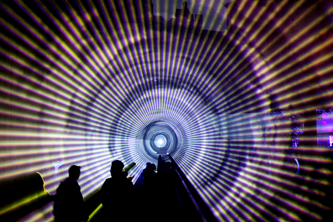 Mit einem Lichtspalier wurden die zahlreichen Gäste aus aller Welt willkommen geheißen und zu den Torbögen weitergeleitet.