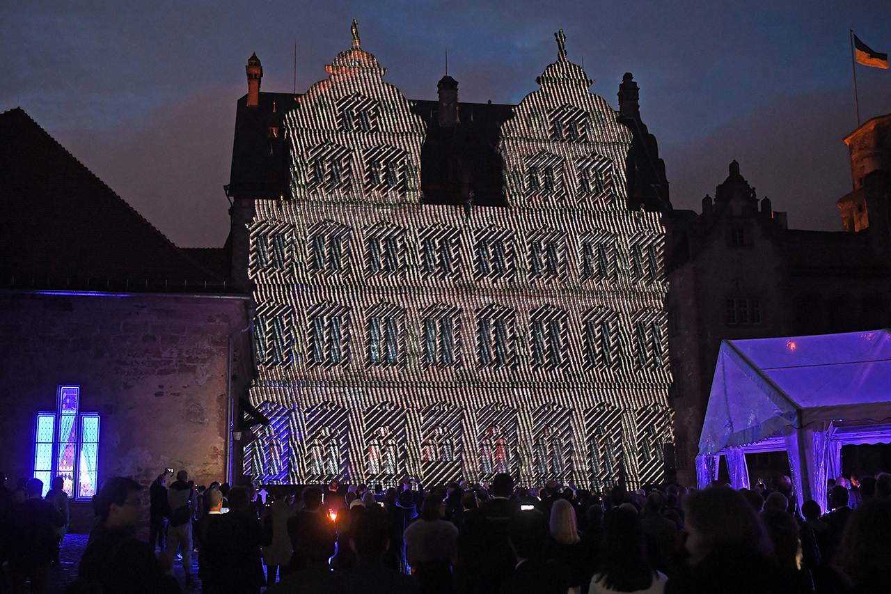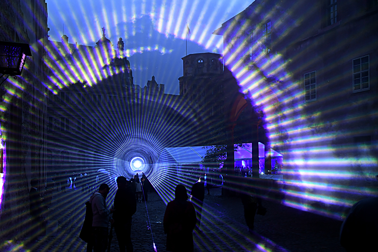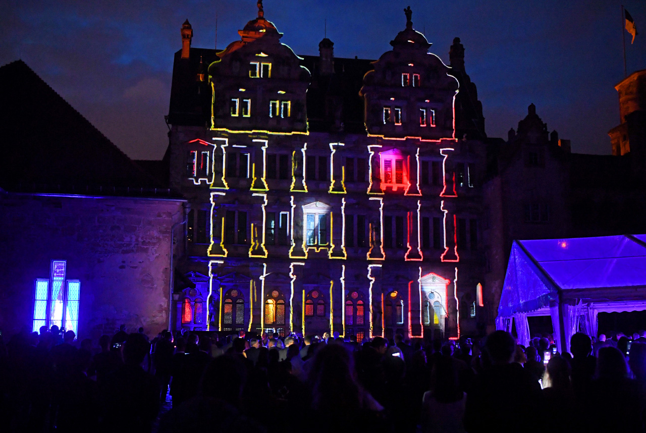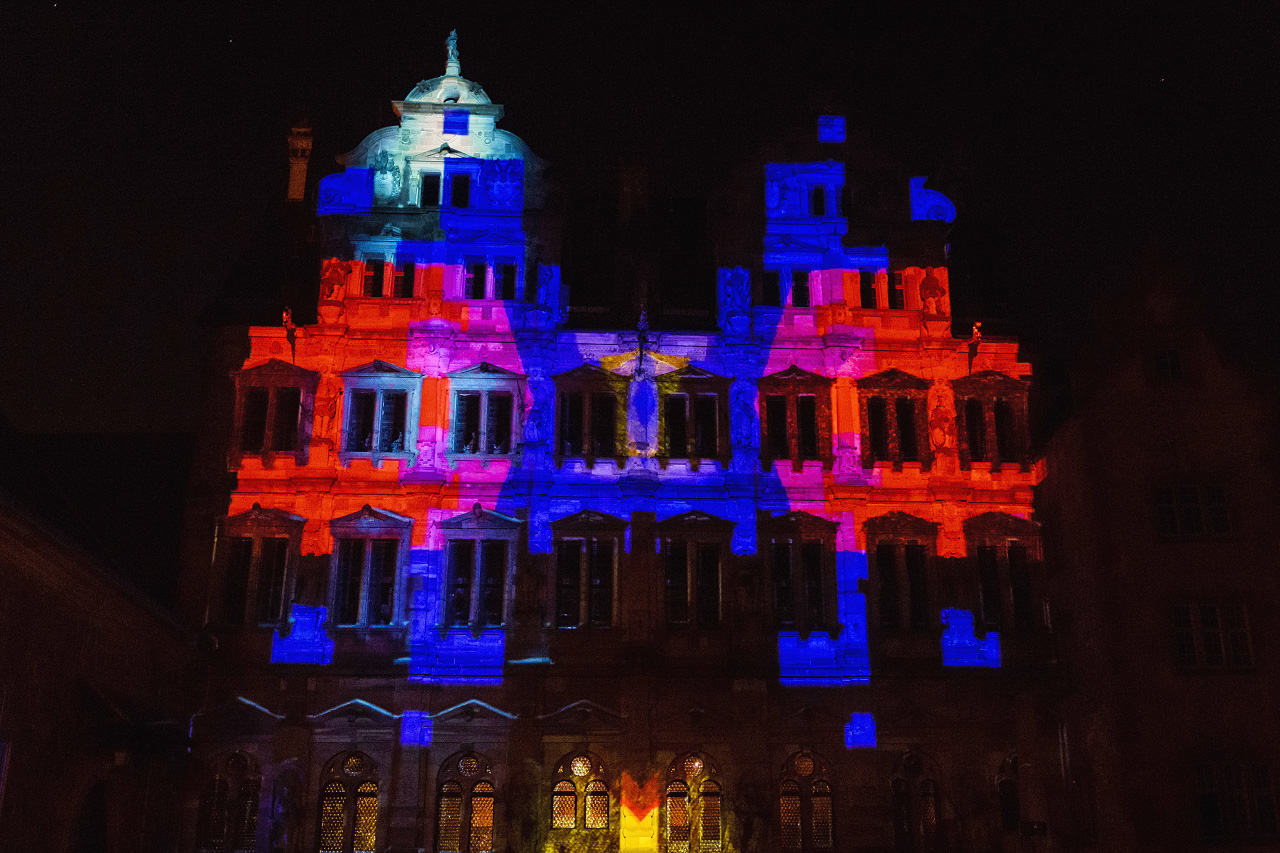 Im Innenhof des Heidelberger Schlosses wartete dann das ultimative Highlight des Abends. Eine Lichtinstallation auf der beeindruckenden Fassade des Friedrichsbaus (erbaut im 17. Jahrhundert) mit einer Gesamtlänge von 16 Minuten. Genauer gesagt erwartete die Gäste eine Lichtsymphonie aus fünf Akten.
